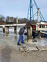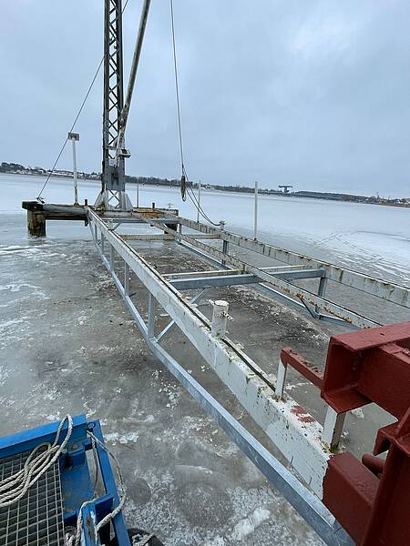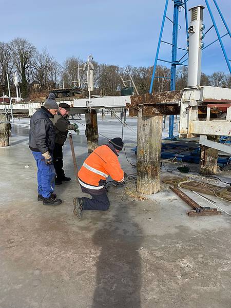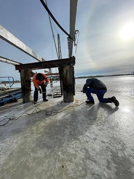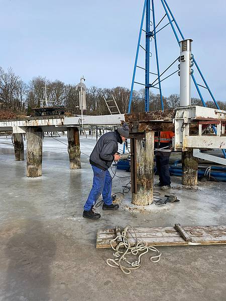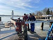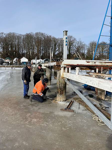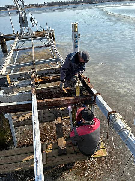 Das waren größere Arbeiten, welche hier anstanden. Die Traversen des Stegs zeigten Roststellen und einege andere Mängel, welche einer Instandsetzung bedurften. Das Angagement der Sportsfreunde und auch das handwerkliche Können, hat zum Erfolg der Instandsetzungsarbeiten geführt. Der Winter war uns in diesem Fall gut gesonnen und so konnte auf Grund der Tatsache, dass die Spitzenhörnbucht zugefrohren war und es tragfähiges Eis gab konnte viel auf dem Eis gearbeitet werden.